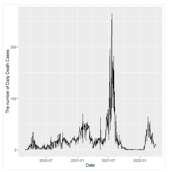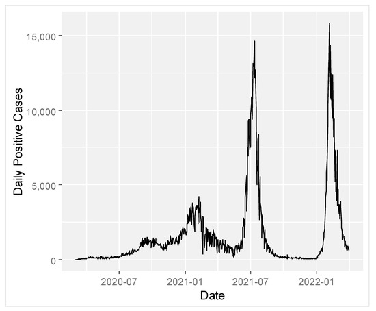 The first COVID-19 case in Indonesia was detected on 2 March 2020, in Depok, West Java. Afterward, many cities and provinces in Indonesia were attacked by this virus. According to the data from the Coronavirus COVID-19 Global Cases by the Center for Systems Science and Engineering (CSSE) at Johns Hopkins University (JHU), as of 1 April 2022, a total of 6,015,748 confirmed cases with 155,164 deaths were documented [7]. In addition, Jakarta is one of the most impacted provinces in Indonesia, with 20% positive cases and 9% death nationwide. Jakarta, Indonesia’s capital city, is one of the provinces with the highest degree of community transmission, indicating a high risk of COVID-19 infection for the general population [8]. The daily new COVID-19 cases in Jakarta from 2 March 2020 to 3 April 2022, are shown in Figure 1. This consists of the implementation of some stringent quarantine protocols in place.