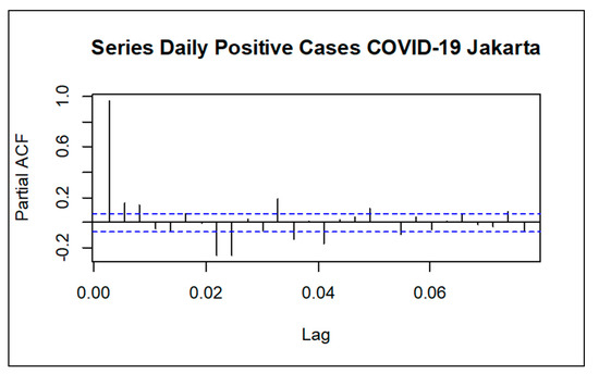 PACF Plot for Daily Confirmed Positive Cases of COVID-19 Data in Jakarta.