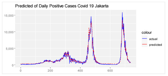 Figure 4 shows the plot of actual data layered by predicted data obtained using the NNAR model (27,28,1). Furthermore, the plot indicates that the predicted data almost follows the actual data. It means that the prediction model can predict the confirmed positive cases of COVID-19 in the future. Additionally, it is supported by the MAE value of 298.142, RMSE of 453.75, and the R Square value of 0.939.
