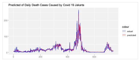 Figure 6 shows the actual data plot and the predicted data using the NNAR model (24,9,1). The plot indicates that the predicted data are almost in accordance with the actual data. It means that the prediction model can be used to forecast the death cases due to COVID-19 in Jakarta in the future. In addition, it is supported by the MAE of 6.41, RMSE of 9.41, and the R Square value of 0.8417.