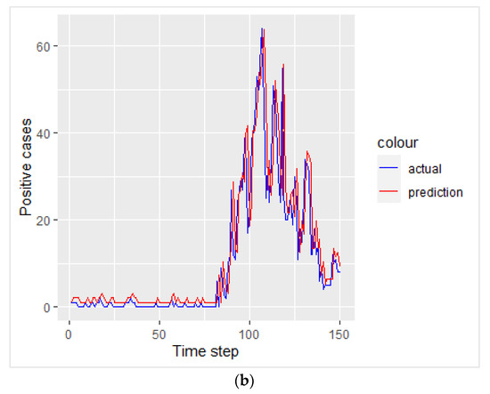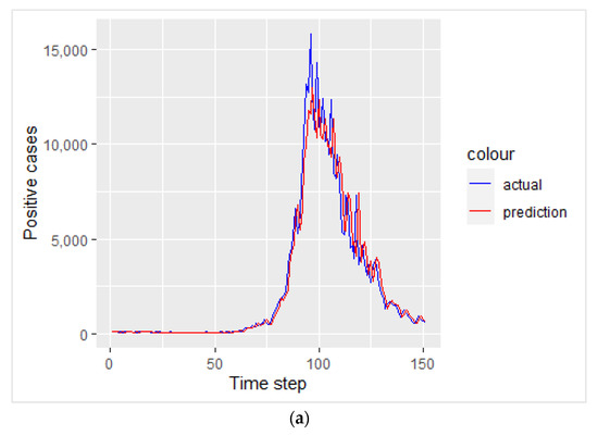 From Figure 7, it can be seen that in the case of the positive cases, the decrease in loss function becomes constant after five epochs and stops at 24 epochs, while for the death cases, the decrease in loss function becomes constant after ten epochs and stops at 25 epochs. After determining the parameters to be initialized to get the best model, we can see the plot between the actual data and the predicted data from the best model for the test data in Figure 8.
