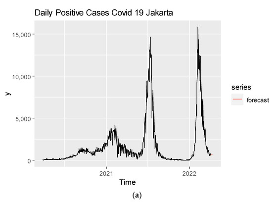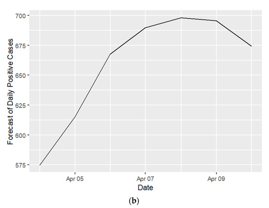 The forecast results can be shown in Table 2. It shows that in the seven periods after 3 April 2022, starting from 4 April 2022 to 10 April 2022, daily confirmed positive cases of COVID-19 will increase, and there is a significant increase. Figure 9a shows the confirmed number of COVID-19, which tends to increase day by day from 4 April to 8 April. Moreover, Figure 9b shows the confirmed positive cases of COVID-19 are predicted to experience declines from 9 April.