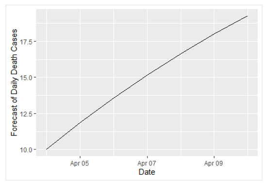 Table 3 shows the multi-step forecast of daily death cases caused by COVID-19 for the following 7 periods from 4 April 2022 to 10 April 2022. The results show that the death cases caused by COVID-19 in Jakarta will experience a small increase, with only one or two death cases each day. Additionally, the increase in the number of death cases is not significant, as shown in Figure 10.