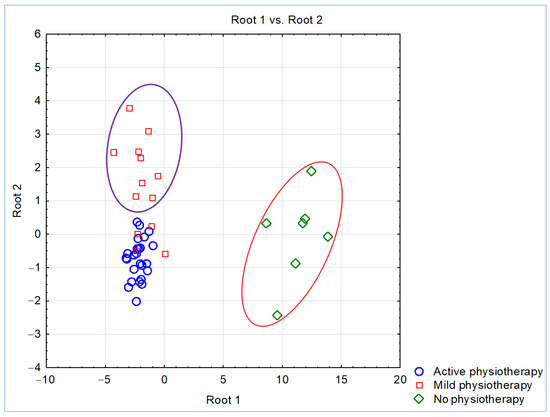 Figure 1 shows the classes by representing the individual scores of the subjects investigated during the main discriminating functions. Scatterplot of canonical scores, expressing clinical and biological variables (independent variable) against the type of physiotherapy performed (grouping variable): mild physiotherapy, active physiotherapy, and no physiotherapy patients.