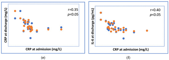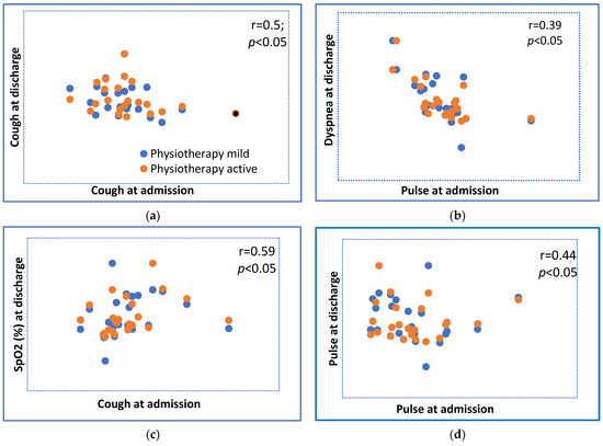 In terms of the efficacy of the two physiotherapeutic procedures, the performed non-parametric statistical tests showed that the analyzed data were not normally distributed (p ˂ 0.05) with the Spearman correlation coefficients revealing statistical significance between the investigated parameters of r = 0.30–0.91 (p < 0.05). Statistically significant correlations were found between the groups of patients undergoing mild vs. active PT parameters evaluated at discharge for cough (r = 0.50; p < 0.05), dyspnea (r = 0.39; p < 0.05), oxygen saturation (r = 0.59; p < 0.05), pulse (r = 0.44; p < 0.05), CRP (r = 0.35; p < 0.05), and IL-6 (r = 0.40; p < 0.05) (Figure 2).