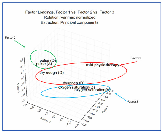 The third factor represents 12.5% of the total variation of the data set and is represented by the oxygen saturation values at admission/at discharge. The results of the Man-Whitney U test showed that the parameter oxygen saturation at hospitalization has a statistical difference between the groups of patients who participated in mild/active physiotherapy (p = 0.036). In fact, oxygen saturation values are a significant parameter in the diagnosis of patients with COVID-19, especially in establishing the severity of the disease.