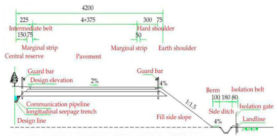 For expressways, the foundation soil is located above the groundwater table isoline and is in an unsaturated state. In the unsaturated subgrade, the volumetric moisture content increases with rainfall. Therefore, the strength of the foundation soil is minimized, and it leads to instability and different settlement of the subgrade. In order to prevent instability and reduce different settlements after completion, a long–short pile composite foundation [4,5] is adopted. This enables piles of different lengths and stiffnesses to carry more loads with a decrease in the proportion of the load on the soil in the subgrade. Moreover, it makes up for the decrease in the soil strength caused by wetting deformation. However, the pile foundation greatly increases the cost of an expressway’s construction, and the long-term performance of the pile is still unclear. The composite foundation using foamed cement banking (FCB) as a replacement is another effective treatment measure [6]. FCB is a light-weight material with low density, high strength, and low permeability. By minimizing its weight and permeability, the instability and settlement problems are effectively delayed due to the wetting deformation of the expressway pavement. However, FCB is still in the research stage. The influencing factors of its strength and permeability are still unclear. Wang [7] used a soil stabilizer to reinforce the silty clay for the subgrade. He studied the pavement’s performance with a mixture composed of the best proportion, which provided the basis and reference for similar engineering applications. Apart from using a soil stabilizer, Zhao [8] proposed that the recycled fine soil of construction waste with a diameter under 5 mm could be used in expressway subgrade. The soil was validated as a good subgrade material through basic experiments. However, the existing improvements were all treatment methods based on materials without considering the wetting distress on the long-term performance. The construction cost has increased because of these methods, and long-term performance under wetting and drying cycles is unclear. Hence, we propose effective measures to block the infiltrating rainwater in the subgrade through a capillary barrier.