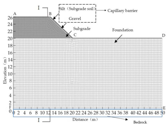Figure 3 shows the model of the subgrade with a capillary barrier. The figure on the horizontal axis means the distance from the road’s central line. The figure on the vertical axis means the height of the pavement to the bedrock. A subgrade section was selected in Guangzhou. The height of the foundation was 20 m. The height of the subgrade was 6 m. The slope of the shoulder was 1:1.5. Due to the symmetry of the subgrade, the simulation only took half of the subgrade for the research. This paper studied two subgrade models: (1) a conventional subgrade; (2) a subgrade using a capillary barrier. The conventional subgrade was composed of a single soil layer, while the subgrade protected by a capillary barrier added a capillary barrier on the slope shoulder. The subgrade soil was used as fill with a thickness of 0.3 m. The thickness of the gravel was 0.2 m.