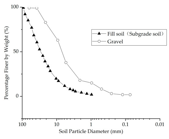 The physical properties of soils for the subgrade with a capillary barrier are shown in Table 1 and Table 2. Based on the data in Figure 4, the coefficient of uniformity of the gravel was 14 and that of the fill soil was 6.4. The coefficient of the curvature of the gravel was 2.8 and that of the fill soil was 1.2. According to the Standard for Classification of Engineering Soils [26], the fill soil was classified as the silty clay of well gradation, and the gravel was well graded. The soil involved in this paper included foundation soil, subgrade soil, and gravel. In view of the similar moisture migration properties of the foundation and the subgrade, the identical hydraulic characteristic parameters were used for the subgrade and the foundation to facilitate the study. In the numerical simulation, the soil water characteristic curve of the subgrade soil was based on the test data from Jun Luo [3]. The soil water characteristic curve of the gravel was based on the test data used by Morris et al. [27]. The saturated permeability coefficient of the soil was measured by the constant head method. However, the unsaturated permeability coefficient equation was predicted on the basis of the soil water characteristics using the van Genuchten functions as shown in Figure 2. The ideal elastoplastic M-C model was adopted as the mechanical model for the deformation, and the strength parameters of the foundation soil and subgrade soil were determined by consolidated drained triaxial tests. The results of the triaxial shear test are shown in Table 1. The gravel was only 0.2 m thick due to the fact of its small thickness. In order to ensure the calculations were convenient, the strength characteristics were set to elastic materials and the data, listed in Table 1, were selected based on the elastic modulus test by Yuedong Wu et al. [28].