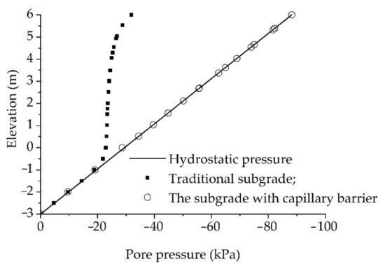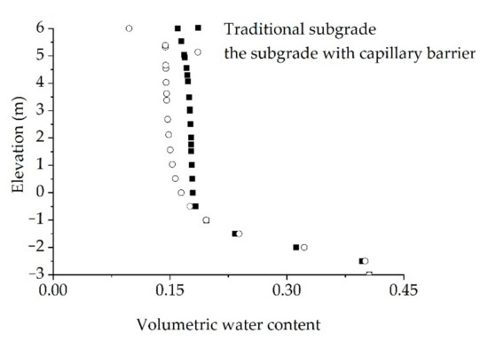 Figure 7 shows the change trend in the volumetric moisture content with elevation. The volumetric moisture content in the subgrade (elevation 0–6 m) was basically constant, which was mainly because the pore-water pressure in the subgrade was basically greater than the inflow value of the fill. In this case, a very small change in the water content caused a huge change in the pore-water pressure. The water-holding capacity of conventional subgrade was basically maintained at 0.17, while the water content of the subgrade with capillary barrier was at 0.14. Compared with the conventional subgrade, the moisture content of the subgrade protected by the capillary barrier was reduced by 18%.