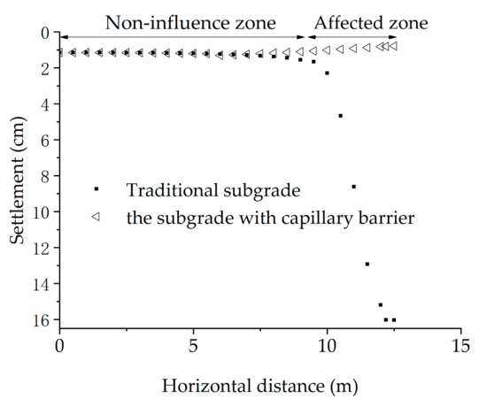 - The settlement of the subgrade using a capillary barrier was uniform and small, and is only 1 cm. Compared with the conventional subgrade, the settlement was reduced by 94%. The safety factor of the subgrade using a capillary barrier was almost unchanged. Compared with the conventional subgrade, the safety factor increased by 15%;
