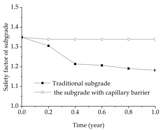 The safety factor can be used to reflect the possibility of slope instability to a certain extent. As the subgrade and foundation are influenced by rainfall, the pore-water pressure in the traditional subgrade decreased, which reduced the overall safety factor of the subgrade. The safety factor was reduced from 1.35 to 1.15 in one year as shown in Figure 10, and the decrease in the safety factor with time was nonlinear. The safety factor of the subgrade protected by the capillary barrier was almost unchanged. This was mainly due to the better blocking effect of the capillary barrier. In one year, the safety factor of the subgrade using a capillary barrier increased by 15% compared to the traditional subgrade.