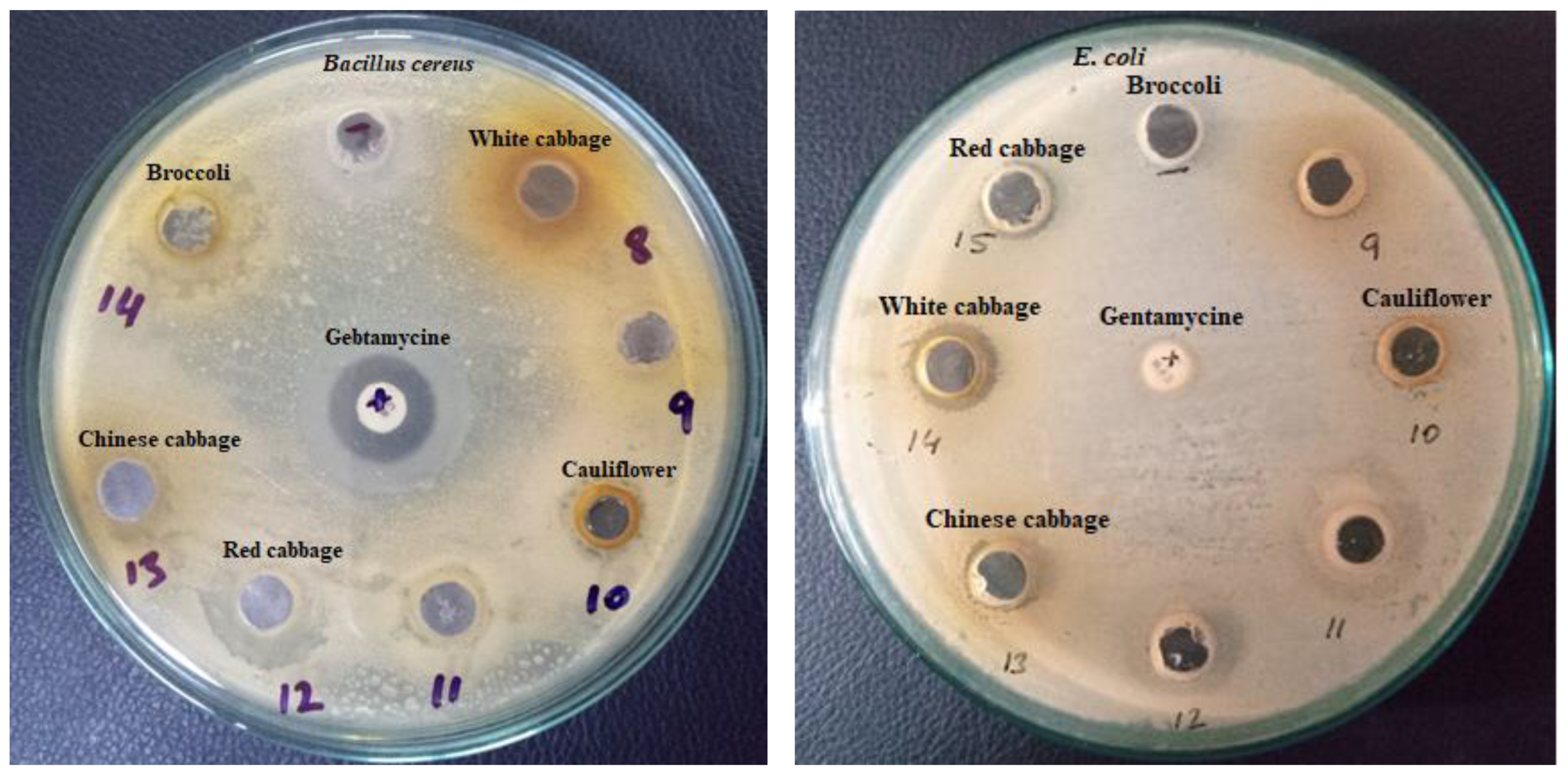 - Waghulde, S.; Khan, N.A.; Gorde, N.; Kale, M.; Naik, P.; Yewale, R.P. Comparative antimicrobial activity study of Brassica oleceracea. Multidiscip. Digit. Publ. Inst. Proc. 2018, 9, 64–76. [Google Scholar]