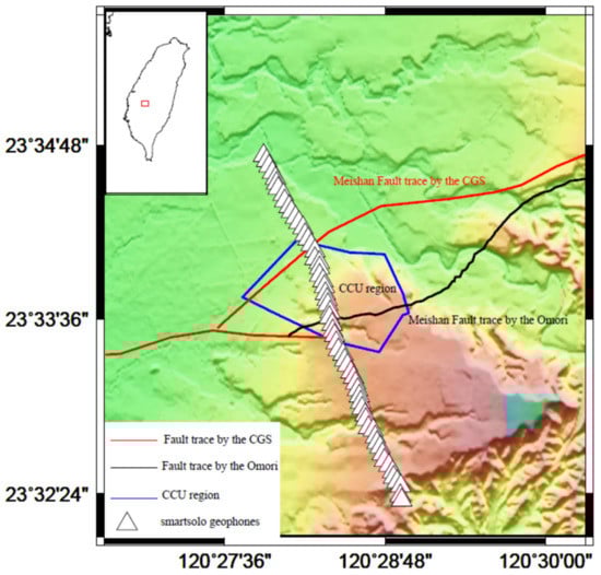 A topographic map showing the locations of the Meishan Fault, seismic stations, and the National Chung Cheng University (CCU) region. The blue box represents the CCU region, and the red and black lines indicated the fault traces of the Meishan Fault obtained by the CGS and Omori [3], respectively. The array of the sixty smartsolo geophones is represented by white triangles. The inset map shows the study area (Taiwan).