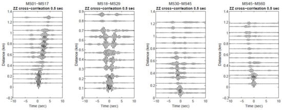 The data processing procedures of Wang [12] were followed; these use the continuous data stream of the array to obtain the monthly stacked cross-correlation function between stations from the ambient noise signal. First, we divided the vertical component record into segments with lengths of 300 s and converted the data into the frequency domain. Because ambient noise is not flat in the frequency domain, if we do not without the temporal normalization, which reduces the effect of earthquakes, the small resonance is typically not seen. Second, spectral whitening acts to broaden the band of the ambient noise signal in cross-correlations and also combats degradation caused by persistent monochromatic sources [13,14,15]. As aforesaid, to retain the cross-correlation function signal amplitude information on the cross-correlation functions, it is needed to reduce the impact of seismic events. After processing the spectrum whitening, the cross-correlation functions between stations were calculated, and the records were then converted back to the time domain. In the final step, we stacked and normalized the cross-correlation functions into 300 s windows. The array was divided into four sections for displaying the cross-correlation functions. Taking the 0.5 s period as an example, clear Rayleigh waves are observed on both the positive and negative time lags (Figure 2). For enhancing the signal-to-noise (SN) ratio in this study, the positive and negative time lags were stacked, and symmetric cross-correlation functions were constructed and used in this study.