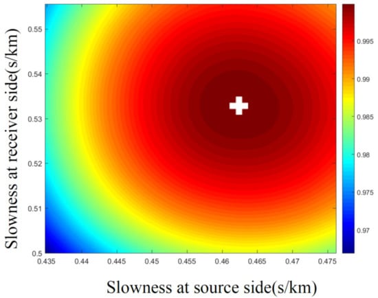 The maximum amplitude of the envelope of the stacked waveforms with respect to source beam slowness and receiver slowness for Stations MS22 and MS34, taken as an example. The color bar represents the amplitude of the stacked waveforms for each slowness, and the white cross indicates the location of the maximum amplitude.