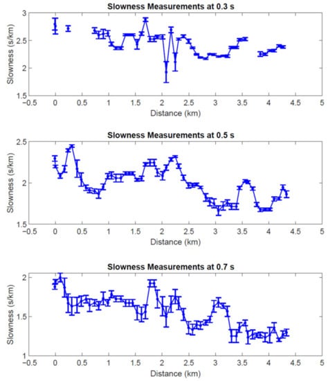The slowness measurements along the entire array at periods of 0.3 s, 0.5 s, and 0.7 s. The error bars show the uncertainties of the mean slowness.