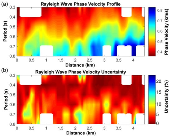 (a) The Rayleigh wave phase velocity profile and (b) its uncertainty profile as measured by the double beamforming method.
