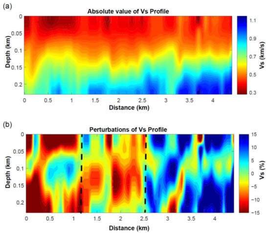 Figure 7a shows the shear wave velocity profile across the Meishan Fault. In the shear wave velocity profile, velocities generally increase with depth. The Vs is approximately 0.3 km/s at the surface and increases to approximately 1.1 km/s at depth. There are no clear lateral variations at the same depth in the velocity profile; however, the distribution of Vs shows a similar pattern to the phase velocity profile (Figure 6a) of the Rayleigh wave. For example, the contour of Vs = 0.6 km/s from 1.1 to 2.5 km along the profile and between 0.1 km and 0.15 km in-depth, and the U-shaped features mimic the Rayleigh wave phase velocities. Figure 7b shows the perturbations of the Vs profile and the perturbations relative to the average shear velocity at each depth. In the perturbations of the Vs profile, a clear transition between low-velocity and high-velocity materials is observed at approximately 2.5 km distance along the profile.