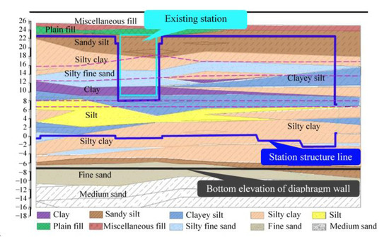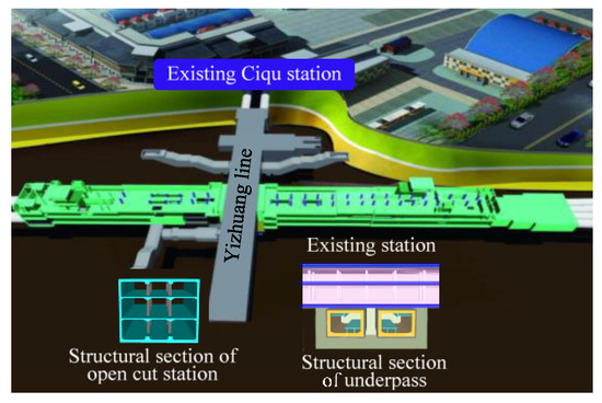 The newly built Ciqu station is a kind of island station, in which the open excavation at both ends is the underground three-layer box frame structure, and the central part that underpasses the existing line is flat top and straight wall under concealed excavation construction. The total length of the station is 415 m, the standard section is 23.1 m in width, the structure net height is 22 m, the bottom plate buried depth of the station center line mileage is 25 m, and the absolute elevation of the rail roof is 1.963 m. The existing station is divided into two separate foundation pits, the total length of the foundation pit is 286.1 m, the depth of the existing station is 25.85 m and the width is 30 m, the depth of the ground wall is set to 13.8 m, which is inserted into the water barrier. The existing station is an open double-layer three-span frame structure with net height of 13.2 m, net width of 20.7 m and bottom plate buried depth of 16.2 m.