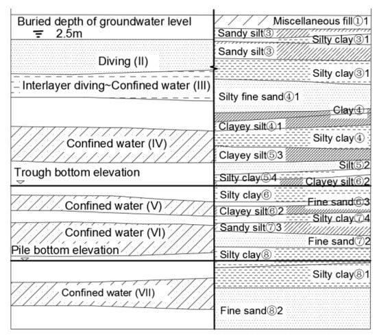 The Ciqu station is largely affected by phreatic water-confined water and confined water. The groundwater level is located above the bottom plate of the station structure, and the buried water level is shallow. According to the burial depth and groundwater dynamic change characteristics, it can be divided into upper stagnant water, phreatic water, interlayer phreatic water-confined water and confined water. The hydrogeological profile of the new station is shown in Figure 3.