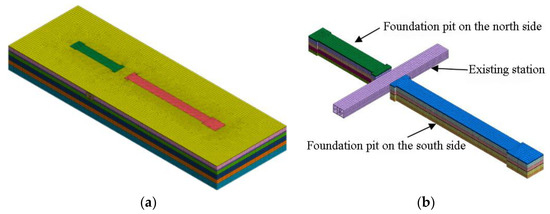- Zhang, G.; Han, X.; Li, Y.; Liu, Q. Numerical Simulation on Interaction between New Foundation Pit and Existing Metro Station. Tunn. Constr. 2011, 31, 284–288. (In Chinese) [Google Scholar]