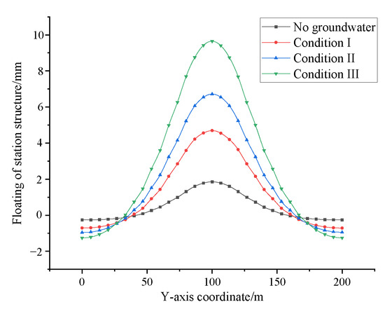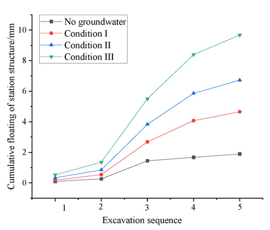 As can be seen from Figure 5, the upward deformation caused by confined water increases the structure deformation of the three construction conditions. The deformation led by excavation is 1.89 mm, and the deformation caused by confined water (V) and above groundwater is 2.76 mm, the deformation caused by confined water (VI) is 2.07 mm, and that led by confined water (VII) is 2.94 mm. Groundwater is the major reason for the floating deformation of the existing station. Foundation pit excavation breaks the relative balance between the upper soil and the confined water top force. Under the action of the confined water top force, the formation is constantly upward, resulting in the floating of the existing station, in which the confined water (VI) and confined water (VII) exert a great impact on the station.