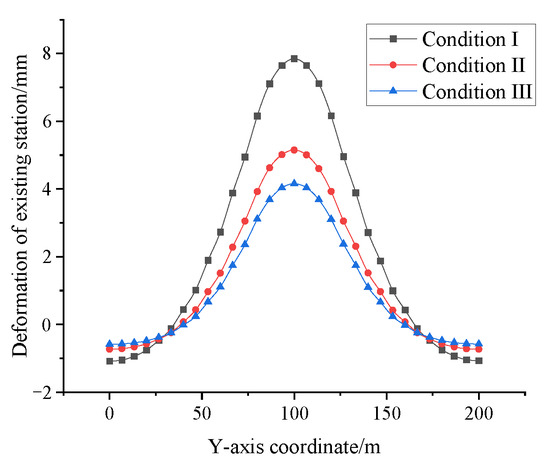 The deformation curves of the existing station under different construction conditions are shown in Figure 8.