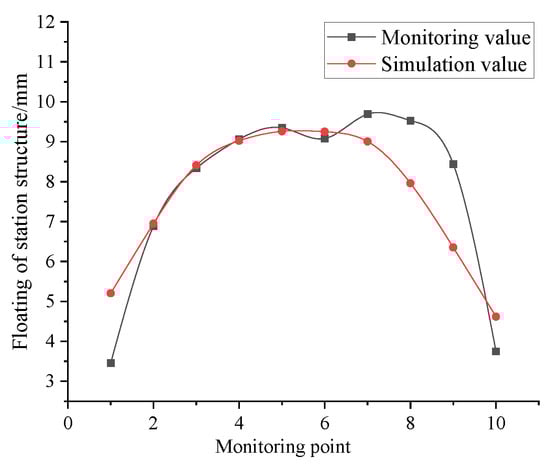 In order to analyze the differences between the numerical simulation and the practical engineering, the monitoring data and the numerical simulation data are compared. The deformation comparison map of the south side of the existing station is shown in Figure 10, the horizontal deformation comparison map of the ground wall is indicated in Figure 11, the floating duration curve of the top of the ground wall is shown in Figure 12, and Figure 13 includes the surface deformation comparison map.