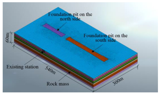 The corresponding numerical model is established in accordance with the engineering situation of the Ciqu station. The model contains both stations and foundation pits on both sides of the north and south. The diameter of the model is: 600 m in length, 200 m in width and 70 m in height. The modified M-C (Mohr-Coulomb) model in MIDAS/GTS is applied in this paper. Compared to the M-C model, the modified MC model consists of a nonlinear elastic and elastic-plastic model with no effect between shear and compression yield, thus correcting the abnormality of pit bottom and surface uplift in the M-C model, and eliminating the problem of abnormal soil uplift in the M-C model [29].