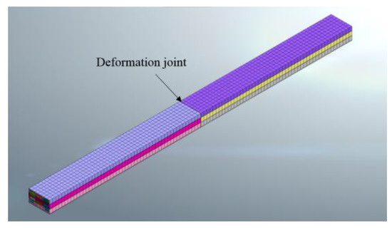 The corresponding numerical model is established according to the construction situation of Ciqu station. The diameter of the model is: 540 m × 300 m × 60 m, as shown in Figure 14, the existing station deformation joint position is shown in Figure 15. The model and material parameters selection are included in Chapter 2.