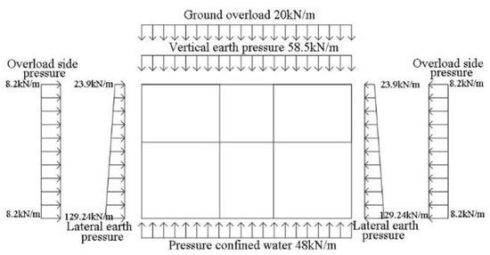 The “load-structure” calculation model is established for the typical section structure above the new tunnel. The typical structural cross-section of the existing Ciqu station in Yizhuang line is shown in Figure 16. A brief diagram of the load calculation is recorded in Figure 17.