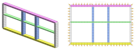 Both for single and double section structures, ground overload and surrounding soil pressure are borne by its roof and side walls. To truly simulate the contact between the side wall and the bottom plate and the soil, the pressure-only soil spring is used to simulate this constraint, and the stiffness of the soil spring at the side wall adopts the weighted average of the horizontal base bed coefficient of the soil layer of the structure, and the vertical base bed coefficient of the soil layer is used in the stiffness of the soil spring at the bottom plate. The computational model and the constrained type of the existing structures are shown in Figure 18.