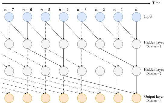 The first instance of CNN being used for the task of amplifier and distortion effects modelling was presented in [25] for the emulation of tube amplifiers and their follow-up article [26] for the emulation of distortion pedals, where the authors use a feed-forward variant of the WaveNet architecture from [27]. This autoregressive architecture from Deep Mind was originally designed for the generation of raw audio waveforms for speech synthesis. The feedforward variant presented by Damskägg et al. [25] contains a stack of dilated causal convolution layers, which enable for a large field of view without increasing the computational cost of the processing. The dilation is done by only using certain outputs from the previous layers for the convolution operation as illustrated in Figure 1. The larger field of view means that the network can be exposed to more past information and is thus able to better model long-term dependencies of the signal.