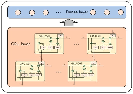The neural network used in this paper is the Gated Recurrent Unit (GRU) network. The GRU network mainly includes the reset gate as Equation (2) and the update gate as Equation (3). The update gate is used to control the extent to which the state information at the previous moment is brought into the current state. The larger the value of the update gate, the more state information from the previous moment is brought in. The reset gate is used to control the degree of ignoring the state information at the previous moment. A smaller reset gate will produce a higher degree of ignoring.