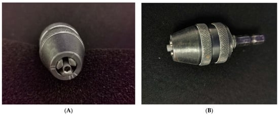 Another challenge of the digital implant impression technique is the need for intermediate impression accessories (i.e., scan bodies), which are sometimes available in one standard dimension for a particular prosthetic connection. They cannot be customized, unlike conventional impression copings []. The geometry of these devices has different characteristics that are specific to each manufacturer and restoration []. The accuracy of digital intraoral impressions seems to be affected by both the geometry of the scan body and the scan strategy []. In the everyday clinical practice, there are conditions when the complete insertion of a scan body is not possible (e.g., narrow spaces, angled neighboring teeth) or the gingival exposure of a scan body is limited. In some cases, the implants are inserted deep subcrestally, and, thus, the length of the scannable portion of the scan body that is screwed into the implants is reduced. Basically, the scan body does not reach an optimal supragingival level so that it can be scanned accurately. In this study, we propose an accessory for intra/extraoral impression transfer, which could solve all the above mentioned problems, i.e., a slight modification of the Wolfcraft Keyless Chuck Metal 2625000 (Wolfcraft, Kempenich, Germany).