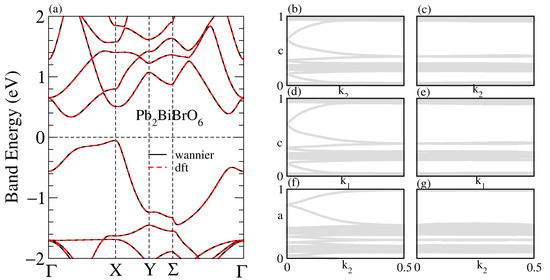 - Mostofi, A.A.; Yates, J.R.; Pizzi, G.; Lee, Y.S.; Souza, I.; Vanderbilt, D.; Marzari, N. An updated version of wannier90: A tool for obtaining maximally-localised wannier functions. Comput. Phys. Commun. 2014, 185, 2309. [Google Scholar] [CrossRef] [Green Version]