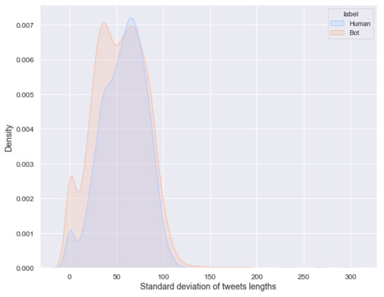 - Statistical measures over tweet lengths: a set of characteristics derived by applying statistical measures, namely, mean, median, maximum minimum range, and standard deviation, to an array containing the lengths, in terms of the number of characters, of the original tweets. In particular, the standard deviation of the lengths of tweets enables us to say whether the user tends to publish tweets of approximately the same length (e.g, identical tweets, which are common among certain types of bot accounts) or tends to vary a lot the size of the published posts. Figure 2 shows that bot profiles are more likely to exhibit a lower standard deviation of tweet lengths than humans, which means that bot profiles are more likely to publish tweets with approximately the same length and presumably the same type of content;