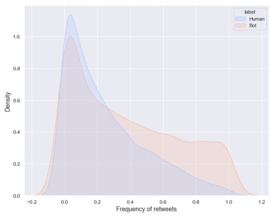 Figure 3. The density of frequency of retweets for each category in the training set.In this way, we are describing the mean number of words (tokens that are not hashtags nor mentioned users) for each published tweet, including duplicates. Since this measure should account for the writing behavior of user u, we decide to exclude from the computation of this property the words contained in retweets, which are tweets that have not been written by u and thus they present a potentially different writing behavior; - Statistical measures over raw counts: set of features derived by applying statistical measures, namely, mean, median, max, min, and standard deviation, to three arrays containing, respectively, the raw counts of the distinct words, hashtags, and mentioned users. Raw counts can be extracted from tokenized published tweets set and tokenized retweets set of a given user u. These measures are computed considering distinct hashtags and mentioned users that appear in both tweets and retweets of user u. We consider distinct words that appear only in published tweets at least three times, and thus when computing these statistical measures on the raw counts of distinct words, we exclude words that appear in retweets of user u. As a matter of fact, these types of measures over raw word counts aim to capture the writing behavior of a given user u. Quite to the contrary, when computing these statistical measures over the raw counts of hashtags and mentioned users, we consider those that are contained in retweets and tweets as well, since it can be arguably verified that a hashtag or a mentioned user that appears in a retweet of user u gains additional exposure even though the user u has posted it through a retweet. These measures can be useful because they can estimate, for example, how the frequency of words varies within the sample of tweets collected for the user u. In particular, a low standard deviation of raw word counts is expected if user u has a uniform behavior when writing posts. In contrast, this value is high if few words are over-used, while many others are less sponsored. For these reasons, these types of measures can help to discriminate between bot profiles and human profiles by analyzing their writing behavior;