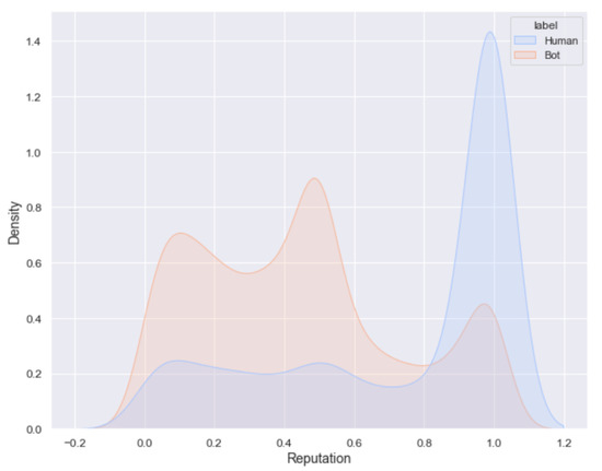 - Reputation: this feature is computed by analyzing the number of followers of a given user u compared to the number of followings, or friends, of the same user:This property exhibits a high value when the user u has a large number of followers and a few followings, such as celebrities and politicians. Quite the opposite, bot accounts that usually have a large number of followings and a few followers are likely to exhibit a low reputation value. Figure 4 shows that high reputation values are easily observable in human accounts, while lower reputation values are more likely to belong to bot accounts;