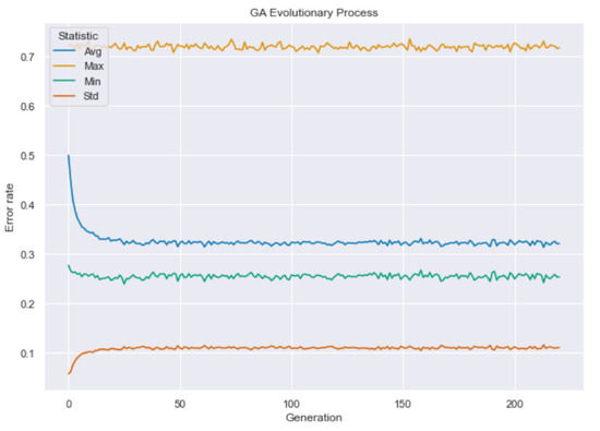 Each generation corresponds to a different random sample from the training set. Moreover, this random sample is balanced in terms of class distribution. In this way, we avoid extracting a sample where a class is overrepresented, and thus we avoid biasing the evolutionary process towards models that are likely to predict the majority class. Since random sampling is repeated at the beginning of each generation, overfitting should be avoided at the end of the evolutionary process. The GA process uses the following settings: