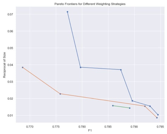 Finally, Table 8 shows different executions of the GP training procedure with different weighting strategies for the involved fitness functions. The table demonstrates that models with lower size exhibit lower detection accuracy, while trees with a higher number of nodes correspond to ML models with better qualitative performance. As a result, increasing the weight for the error rate leads to more complex models with a larger number of nodes and higher scores. That being said, the choice of the best model relies on finding a reasonable trade-off between detection accuracy and formula interpretability. Figure 8 shows that starting from the models described in the aforementioned table, it is possible to obtain three different Pareto frontiers. Each Pareto frontier is a set of non-dominated solutions. A Pareto frontier dominates another Pareto frontier if the former is located in an upper right corner with respect to the latter. As we can see from the plot, an higher F1 score corresponds to an higher number of nodes.