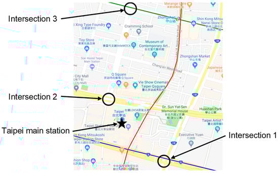We conducted measurement surveys at three intersections in Taipei City. The surveyed intersections are shown in Figure 1. Intersection 1 was located southeast of Taipei main station and was the largest intersection of the study subjects. Intersection 2 was located near Taipei main station, with a nearby bus terminal and large taxi stop. Intersection 3 was located north of Taipei main station and was the smallest intersection of the study subjects. Table 1 shows the characteristics of intersections (i.e., the number of lanes in each direction). The numbers in parentheses are the numbers of lanes available for turning left. Figure 2 displays a view of the three intersections. In Taiwan, vehicles drive on the right-hand side of the road.