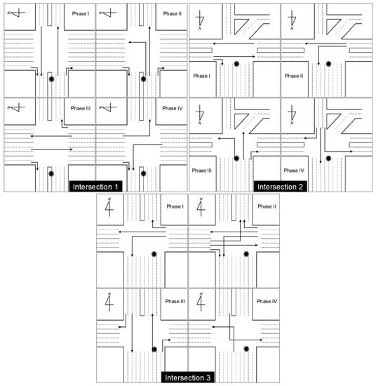 Traffic signal timing was analyzed at each intersection. In all three intersections, four green light phases (from phase I to IV) were assigned to the traffic signal cycles, as shown in Figure 2. For example, at Intersection 2, phases I to IV allowed east–west traffic flow and right turn movements to the north (phase I), vehicle traffic from west to east and left turn movements to the north (phase II), entry into the intersection from the north only (phase III), and entry into the intersection from the south only (phase IV), respectively. Table 2 represents the durations of each green light phase and traffic signal cycle at each intersection. These durations differed depending on the day (weekday or weekend) and time of day.
