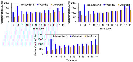 Table 3 presents the range of total traffic volumes at each intersection during the measurement time period (10 min per h) analyzed in each measurement day. The total traffic volumes at Intersection 2 were higher than those at other intersections.