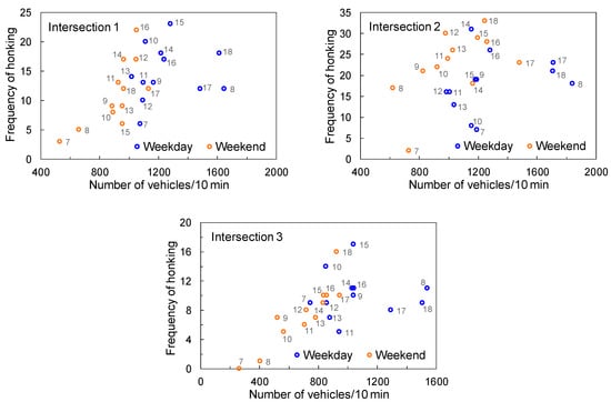 Figure 4 shows scatter diagrams of the total traffic volume and the frequency of horn use during the measured 10 min in each hourly time zone, where the numbers next to data points represent time zones from 7:00 to 19:00. The frequency of horn use approximately increased as the total traffic volume increased at all surveyed sites. Such tendencies become clearer when removing the data for rush hours on weekdays (i.e., 8:00 and 17:00 or 18:00), in particular, at Intersections 1 and 3. As mentioned above, a high traffic volume during rush hours is supposed to relate to a high volume of motorcycles. The correlation between the total traffic volume and the frequency of horn use was analyzed using the data for weekdays and weekends with the data for rush hours eliminated (i.e., data for 9 h on a weekday and 12 h during the day on a weekend). Significant relationships were obtained for Intersections 1 and 3 (Intersection 1: r = 0.71, p < 0.01; Intersection 2: r = 0.35, not significant; and Intersection 3: r = 0.77, p < 0.01).