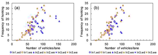 Relationship between the traffic volume per lane and frequency of horn use. (a) Data of all measurement times. (b) Data without measurements during rush hours on weekdays.