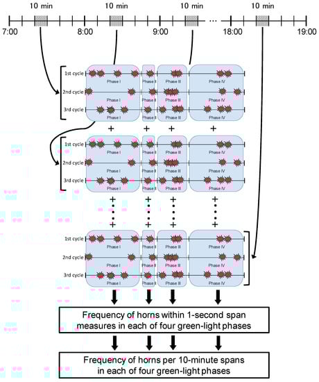The main purposes of the present study were to find the extrinsic factors of driver horn use, such as the behavior of other drivers and the traffic environment, and to propose the countermeasure to reduce driver horn use. Although the actual road conditions and situations surrounding drivers are complicated and change continuously, the relationship between the occurrence of horn use and the traffic environment was investigated. As a case study, measurements and recordings of horn use and the current circumstances of traffic were conducted at urban intersections in Taiwan []. We found traffic features at intersections and relationships between the extrinsic factors, such as traffic count and traffic signals, and driver use of horns. A microscopic analysis was then conducted to examine the quantitative parameters of the traffic environment related to driver horn use []. As a further study, this paper analyzes the effects of vehicle horn use and the traffic environment on the acoustic environment around intersections, i.e., LAeq and LAmax at the measured point at intersections. Furthermore, based on the results obtained, countermeasures to improve the acoustic environment and to reduce drivers’ use of their horns will be discussed. To approach these points, important data on the vehicular environment [,] are restated in this paper.