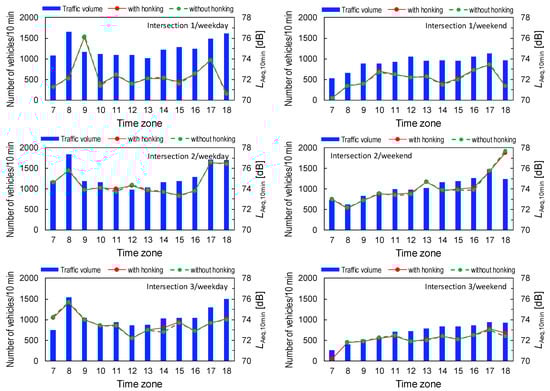 Significant relationships between LAeq,10min and total traffic volume were found for all measurements, except one weekday at Intersection 1 (Intersection 1: rweekday = −0.05, not significant; rweekend = 0.81, p < 0.01; Intersection 2: rweekday = 0.87, p < 0.01; rweekend = 0.76, p < 0.01; and Intersection 3: rweekday = 0.62, p < 0.05; rweekend = 0.85, p < 0.01). Although the values of LAeq,10min when the noise level data of honking were removed were very similar to those when such data were not removed, LAmax sometimes decreased when the noise level data of honking were removed in situations when LAeq,10min values were relatively low.