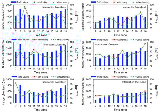 To determine the impact of horn use on the acoustic environment around intersections, we calculated the equivalent continuous A-weighted sound pressure level (LAeq,10min) and the maximum noise level (LAmax) of the RTN, both with and without the use of horns, by vehicles. Data management software (RION AS-60) was employed to calculate the LAeq,10min and LAmax without the use of horns. The data for horn sounds were removed from the initial data, and then both acoustic indices were recalculated. Figure 7 displays the variations in total traffic volume and LAeq,10min during the measurement time for each intersection and each measurement day. The similar results for LAmax are displayed in Figure 8.